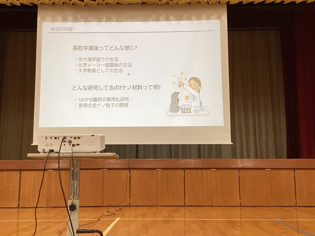10月22日(水)、京都大学大学院理学研究科化学専攻助教の向吉恵さん(16期 卒業)を招聘して、『ナノ材料研究の最前線—卒業生キャリアの一例として—』という演題のもと講演会を開催しました。